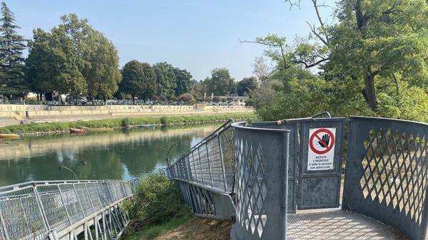 Le passerelle d’accesso all’Adda sono piegate e a un passo dal ribaltarsi: tutt’intorno all’attracco regna uno stato di degrado e di incuria