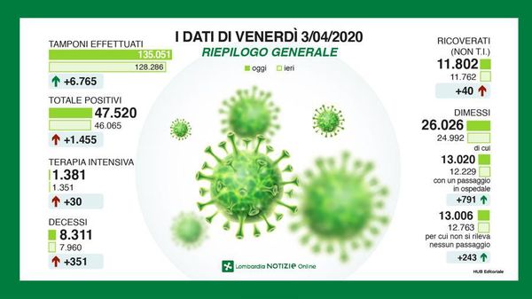 In Regione risulta sempre altissimo il numero di decessi, ma si conferma una tendenza al rallentamento dell’epidemia. Sala: «Non bisogna abbassare la guardia»