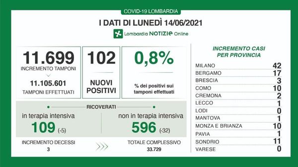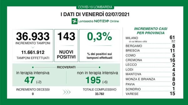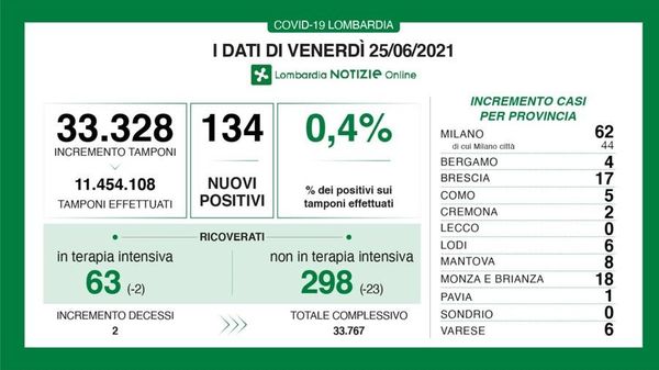 Anche a livello lombardo i dati continuano ad essere incoraggianti con una percentuale di positività sui tamponi dello 0,6%