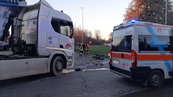 L’incidente intorno alle 16, il centauro è finito contro un camion: traffico in tilt