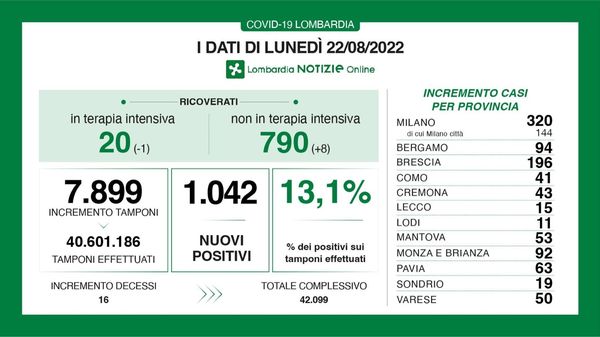 Covid in Lombardia: i nuovi casi oggi sono 1042, 16 i decessi