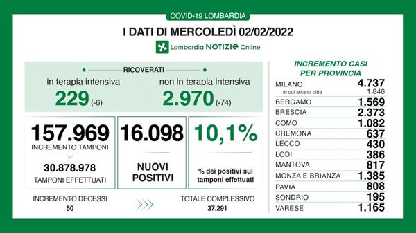 Sono 16.098 i nuovi positivi (10,1%), in provincia di Lodi 386 contagiati