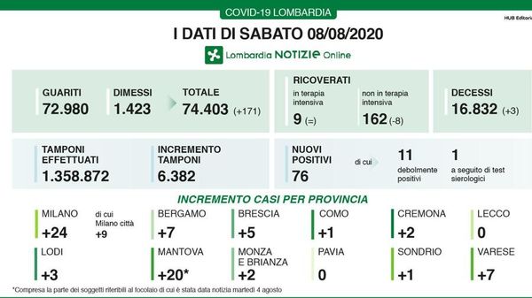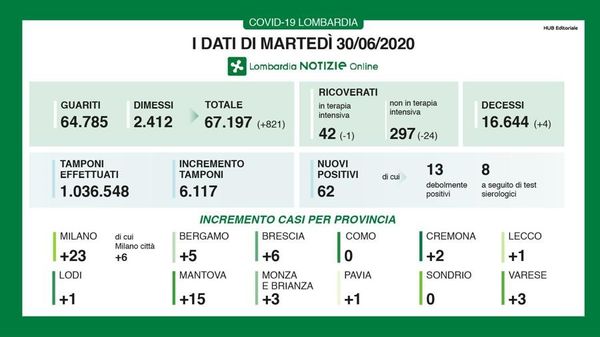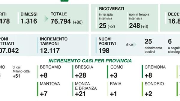 Poco più di 6mila i tamponi effettuati in Regione, un nuovo caso nel Lodigiano
