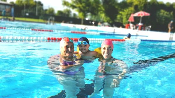 Prima immersione in piscina per il bimbo di 3 anni mentre il papà si prepara alla traversata del lago d’Iseo
