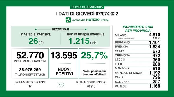 Nessuna variazione nelle ultime 24 ore, nel Lodigiano 289 nuovi casi