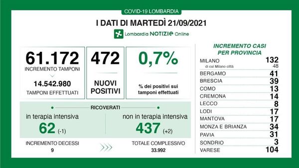 I nuovi positivi sono 450, 7 contagi nella provincia di Lodi