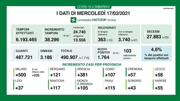 In Lombardia i nuovi positivi sono 1.764 (4,6% dei tamponi processati)