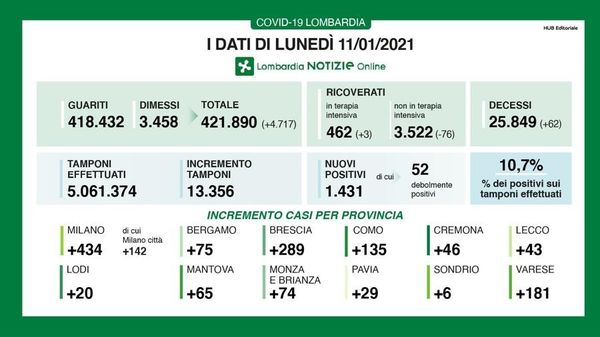 In Lombardia rilevati 1.431 contagi, ma con soli 13mila tamponi. Crescono i guariti