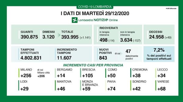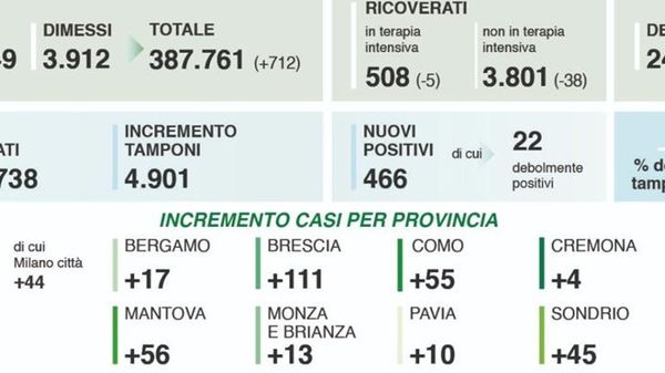 I tamponi eseguiti in Lombardia sono stati 4.901, un decimo rispetto ai massimi dei mesi scorsi, stabile il rapporto tra test e positivi, al 9,5% in regione ma a livello nazionale sale ancora, al 14.8%