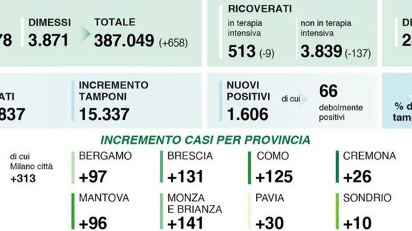 Eseguiti 15.337 tamponi in regione, la percentuale lombarda risale al 10,4%; in Italia è al 12,8%, test ai minimi (81.285)