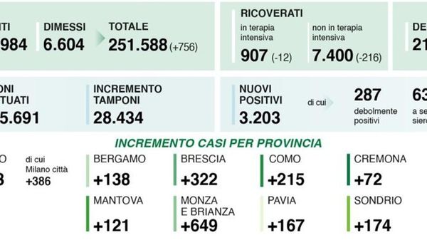I dati della Lombardia: 756 guariti o dimessi, ben 135 i morti