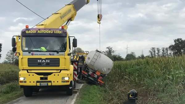 MEZZI PESANTI Problemi anche a Pieve Fissiraga, dove una cisterna carica di gasolio è finita fuori strada
