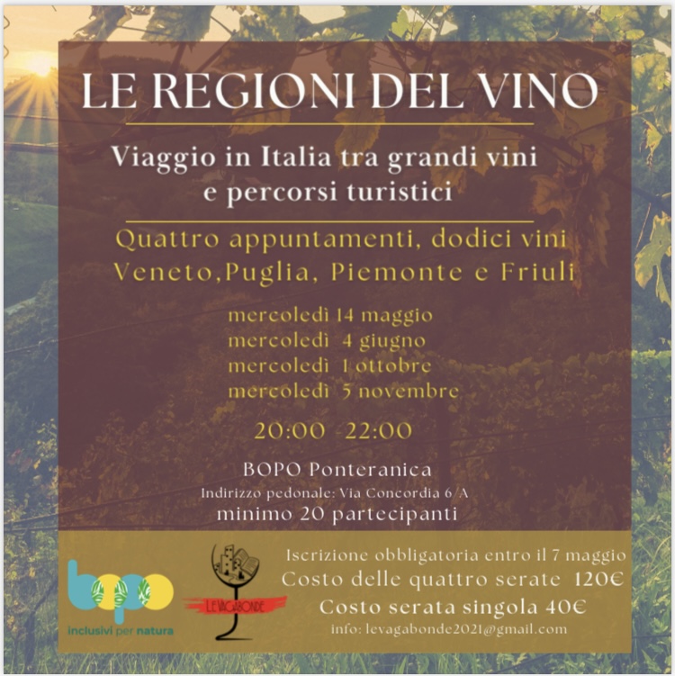Un ciclo di quattro appuntamenti imperdibili per gli amanti del buon vino e delle tradizioni regionali. Ogni serata sarà un’esperienza sensoriale dedicata a una diversa regione italiana: Veneto, Puglia, Piemonte e Friuli, con la degustazione guidata di tre vini selezionati e abbinamenti gastronomici tipici. Un’occasione per scoprire, degustare e conoscere storie, territori e profumi che raccontano l’Italia attraverso il calice.