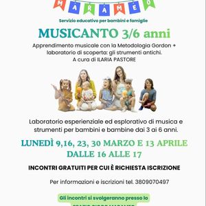 Oggi alle ore 16 fino alle 17 si terrà un laboratorio presso lo spazio gioco Marameo per bambini dai 3 ai 6 anni per esplorare la musica e gli strumenti.