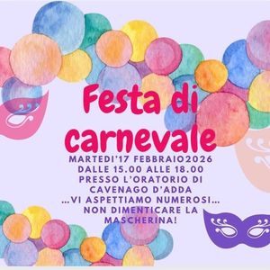 Oggi dalle ore 15 alle 18 si terrà la festa di Carnevale in oratorio. Indossa la tua mascherina.
