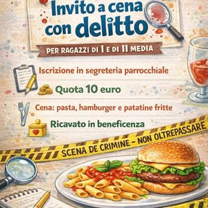 Stasera cena a base di pasta, hamburger e patatine fritte in oratorio a San Bernardo alle ore 20,30 per una cena con delitto su cui indagare. Il ricavato sarà devoluto in beneficienza. Costo 10 euro per ragazzi dalla prima alla seconda media.