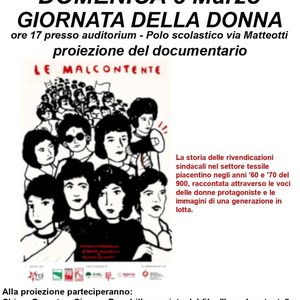 Oggi alle ore 17 presso l'auditorium nel polo scolastico in via Matteotti ci sarà la proiezione del documentario Le malcontente con la storia delle rivendicazioni sindacali ne settore tessile piacentino dalle voci delle protagoniste.
