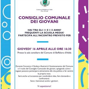 Oggi alle ore 16,30 presso la sala consiliare del Comune di Boffalora d'Adda si terrà l'incontro con il sindaco Livio Bossi che illustrerà alla comunità il nuovo progetto. Il sindaco parlerà ai ragazzi dagli undici ai tredici anni del ruolo del Comune e del suo funzionamento spiegando anche come i giovani possano attivamente partecipare alla vita amministrativa e politica del loro paese. Saranno benvenuti anche i genitori.