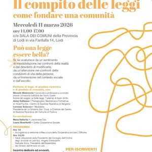 Oggi dalle ore 14 alle 17 presso la sala dei Comuni nella sede della Provincia di Lodi si terrà uno degli appuntamenti del ciclo di incontri Giustizia, territorio, comunità per condividere idee e pratiche trasformative. L'incontro sarà rivolto agli avvocati, assistenti sociali, psicologi ed educatori e alla cittadinanza.