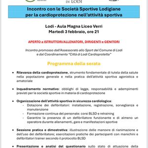 Oggi alle ore 21 si terrà un incontro aperto a istruttori, dirigenti e genitori sulla rilevanza della cardioprotezione e sull'organizzazione di attività sportiva in sicurezza con sessioni pratiche dimostrative. L'incontro si terrà presso l'aula magna del liceo Verri.