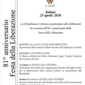 Oggi sotto i portici di palazzo Broletto si terrà la deposizione della corona davanti alla lapide dei Caduti. Alle 9,30 in cattedrale ci sarà la messa celebrata da monsignor Bassiano Uggè. A seguire in piazza della Vittoria partirà il corteo verso piazzale Medaglie d'oro poi rientro in piazza della Vittoria per i discorsi del sindaco e dell'Anpi di Lodi.