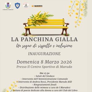 Oggi alle ore 17,30 si terrà l'inaugurazione della panchina gialla da parte del Comune di Marudo in segno di rispetto e inclusione sociale. Appuntamento al centro sportivo e poi alle ore 20 cena alla Mondina a cura dei Marudesi.