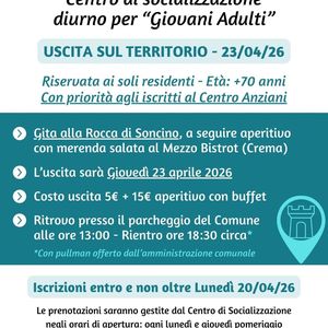 Oggi gli utenti over 70 del Centro di socializzazione di Montanaso andranno in gita alla Rocca di Soncino. Le iscrizioni dovranno pervenire entro il 20 aprile presso la biblioteca comunale di Montanaso.