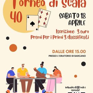 Oggi alle ore 15 presso l'oratorio di Bargano si terrà un torneo di scala 40. Un evento organizzato dal Comune di Villanova del Sillaro con il Circolo San Leone e la collaborazione della parrocchia che mette a disposizione i locali. Iscrizione 3 euro e premi per i primi tre classificati.