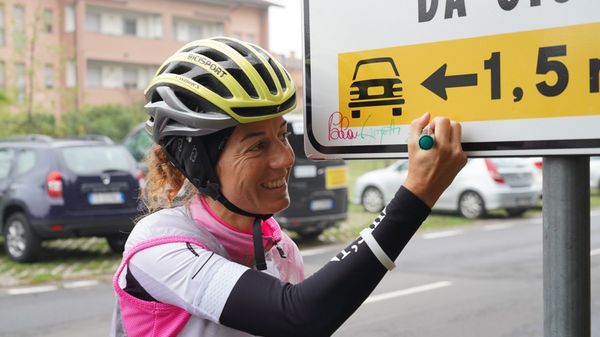 Con la ciclista dei record Paola Gianotti inaugurata la nuova cartellonistica che invita gli automobilisti a mantenere le distanze di sicurezza