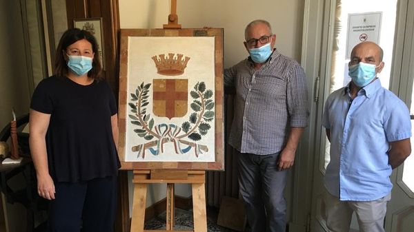 L’opera fatta in materiali di recupero da Pietro Bianchini con Naborre Bosio e presentata dal sindaco Casanova
