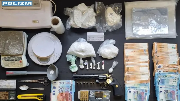 L’operazione La polizia ha scoperto cocaina sigillata in quattro buste, oltre a una 357 Magnum rubata, 20 munizioni, 6 bossoli e tutto il necessario per confezionare le dosi