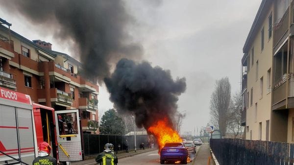 Colonna di fumo nero nel cielo: auto a fuoco a Peschiera Borromeo