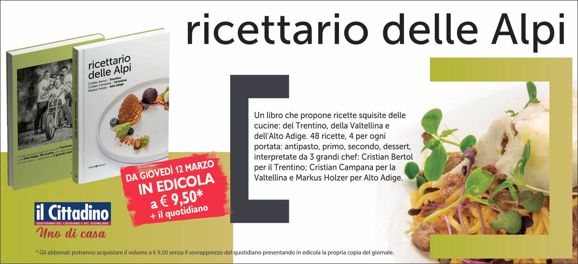 Un libro che propone ricette squisite delle cucine: del Trentino, della Valtellina e dell’Alto Adige. 48 ricette, 4 per ogni portata: antipasto, primo, secondo, dessert, interpretate da 3 grandi chef: Cristian Bertol per il Trentino; Cristian Campana per la Valtellina e Markus Holzer per Alto Adige.