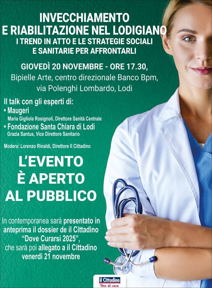 Giovedì 20 novembre alle ore 17.30 a Lodi l’incontro pubblico “Invecchiamento e riabilitazione nel Lodigiano. I trend in atto e le strategie sociali e sanitarie per affrontarli”. L’incontro, a ingresso libero, si terrà alla sala convegni di Bpl Arte, all’interno del cortile della sede di Banco Bpm, in via Polenghi Lombardo.