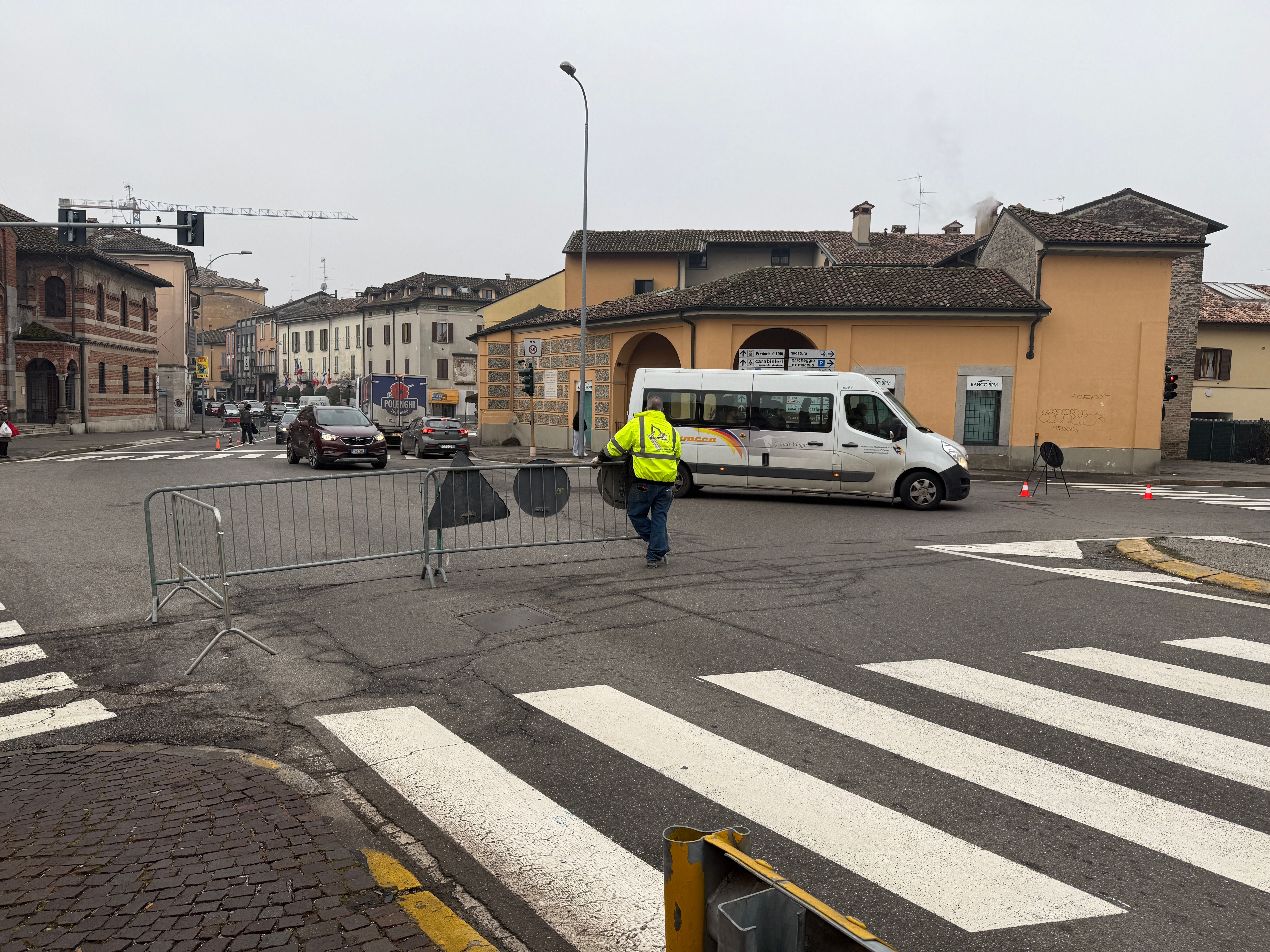 Transenne, presidiate da movieri e agenti di polizia locale, sul lato con affaccio all’incrocio semaforico tra via Defendente Lodi, via Borgo Adda e corso Adda. Chiusa la corsia in direzione Oltreadda sul viadotto, chiusa anche su corso Adda la corsia per proseguire dritto verso il viadotto, con qualche rallentamento conseguente dalla direttrice di via San Giacomo e zona ospedale. Le operazioni si sono concluse già in mattinata. E, nonostante la previsione della vigilia di mantenere il senso unico anche nel pomeriggio, non sarà più necessario, come comunica il Broletto.