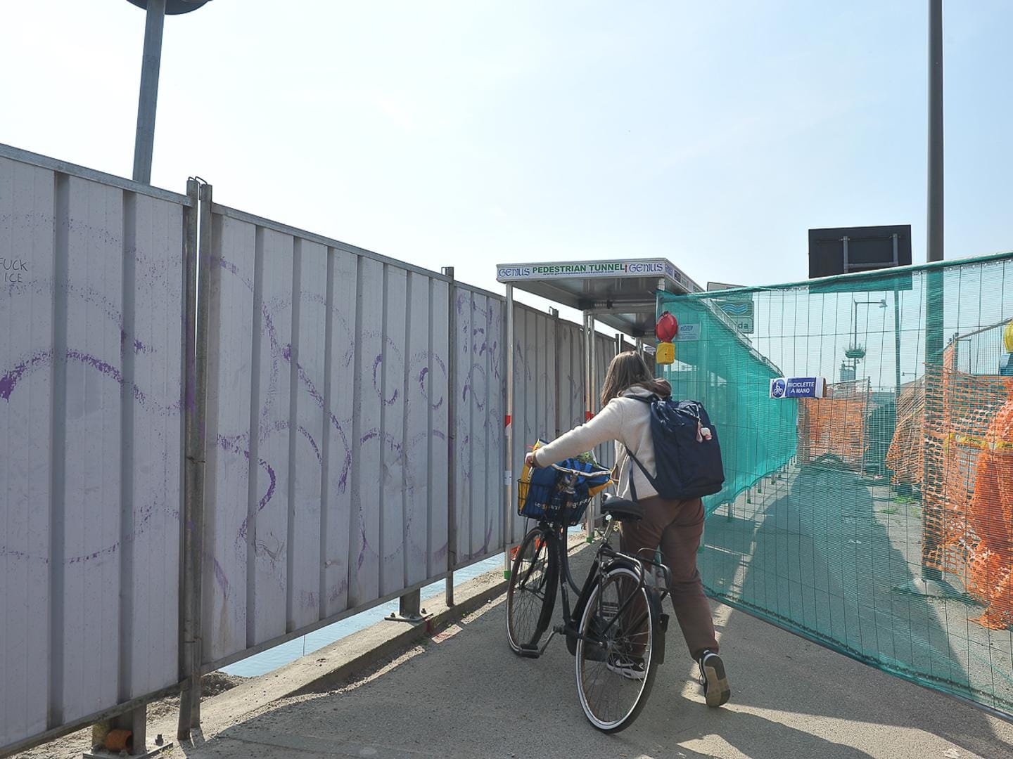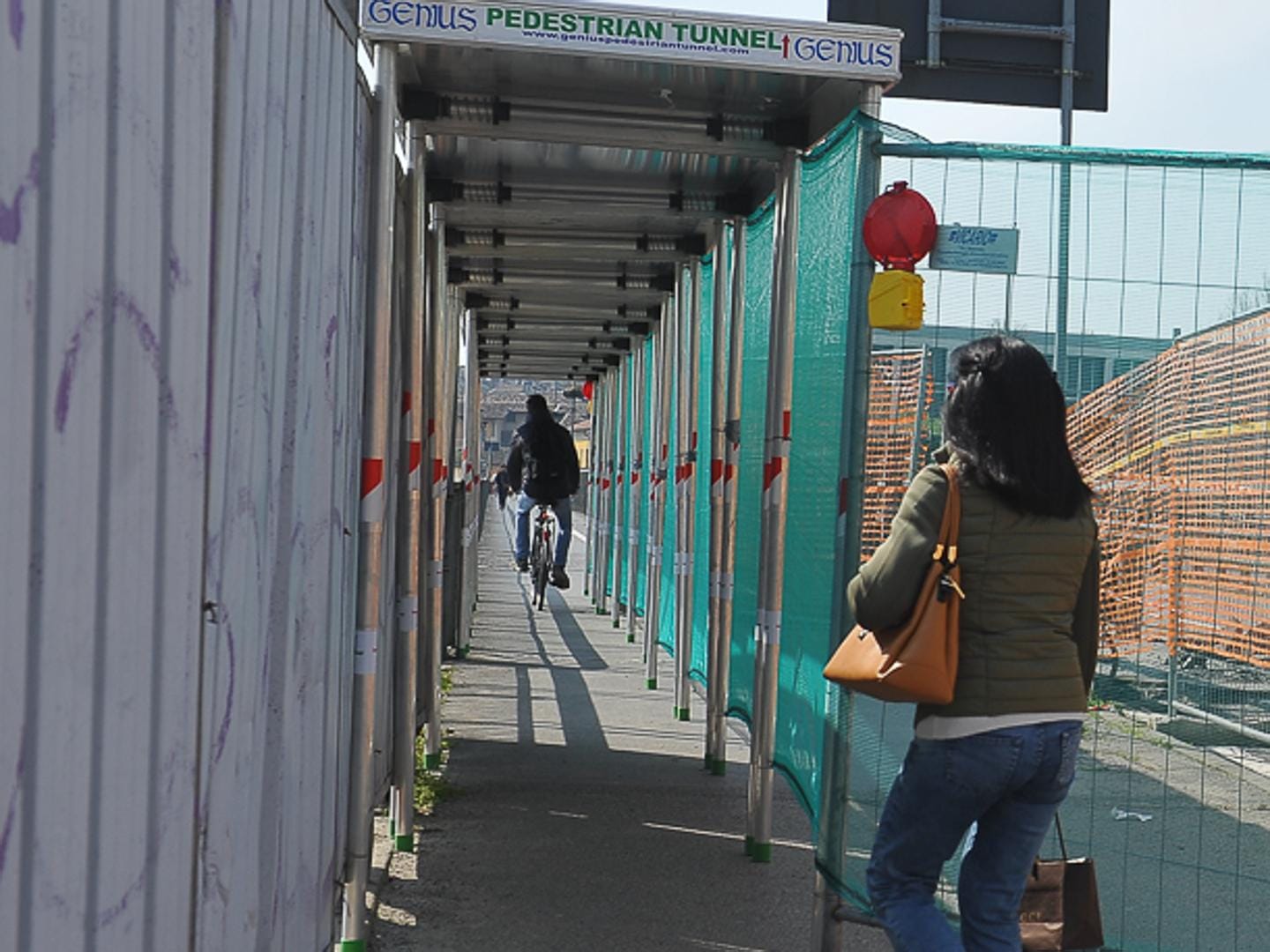 Tetto e barriere di lamiera grecata delimitano lo spazio disponibile. Si passa solo uno per volta, con le due ruote che spesso attendono il proprio turno all’estremità del percorso. A Lodi ai allargano le operazioni Aipo sul ponte Bonaparte, si restringono gli spazi dell’unico collegamento possibile tra le due parti di città divise dal fiume Adda. Oggi ridotti ad un solo tunnel temporaneo allestito ex novo sulla passerella di valle, interamente delimitato da barriere, per tutelare i passanti dall’operazioni letteralmente a un passo dal percorso.